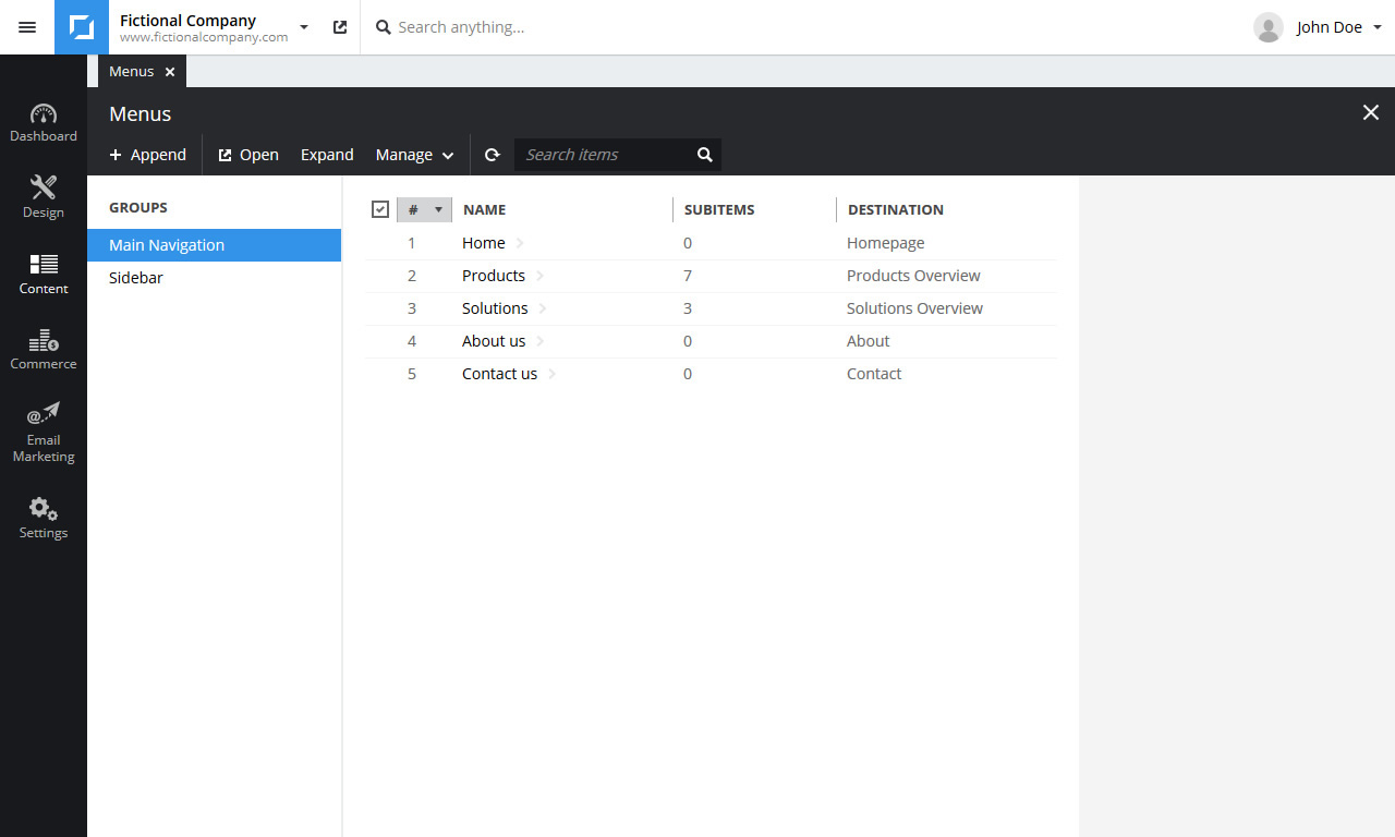 Menus is where you create and edit the menus (navigation) on your website.Menus can have submenus and items can link to internal or external pages.